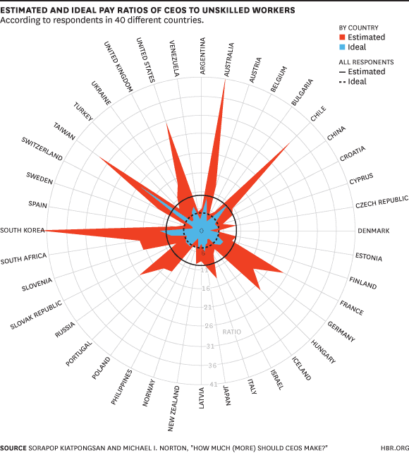 For the countries combined, the ideal pay ratio for CEOs to unskilled workers was 4.6 to 1; the estimated ratio was about double, at 10 to 1. But there were some differences country to country. People in Denmark, for example, estimated the ratio to be 3.7 to 1, with an ideal ratio being 2 to 1. In South Korea, the estimated gap was much larger at 41.7 to 1. The ideal gap in Taiwan was particularly high, at 20 to 1.