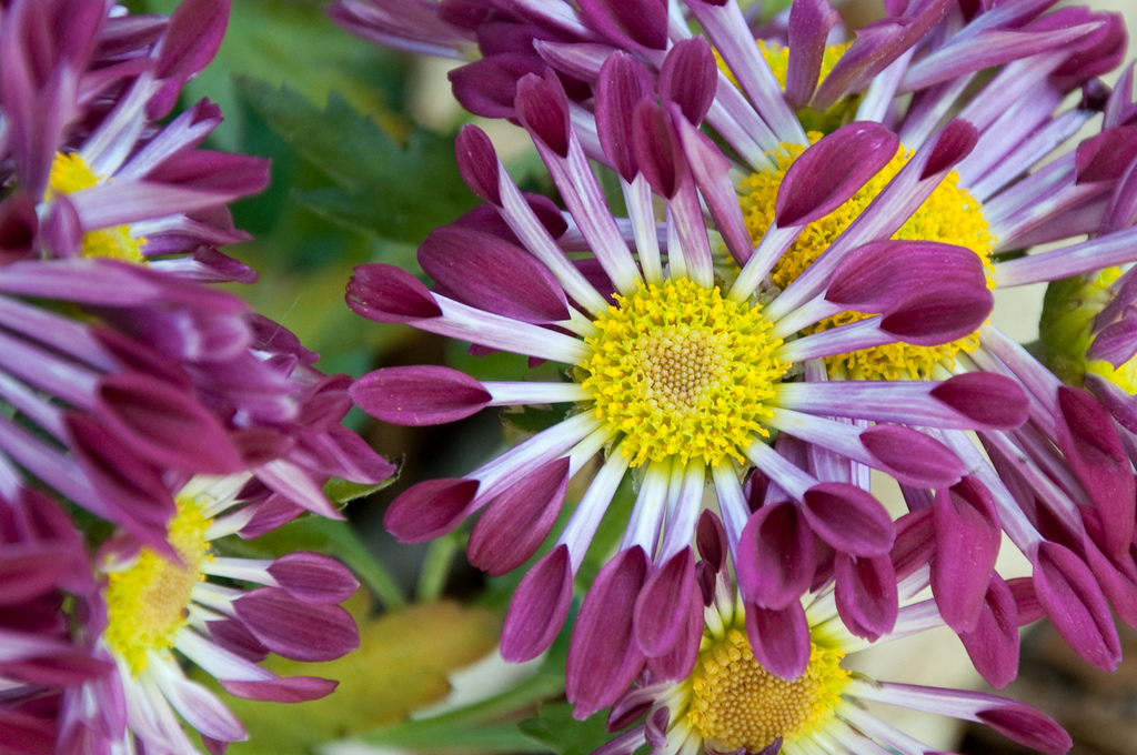 Purple and white spoon or tube shaped petals with a bright yellow center