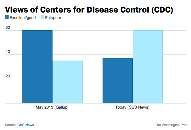 A new CBS News poll shows just 37 percent of American rate the CDC as either excellent or good, while 60 percent rate it as fair or poor — a virtual mirror image of 17 months ago. The worst part: The agency now ranks below the Secret Service, which has dealt with a series of scandals in recent weeks and years. But the CDC is still slightly more popular than the IRS.