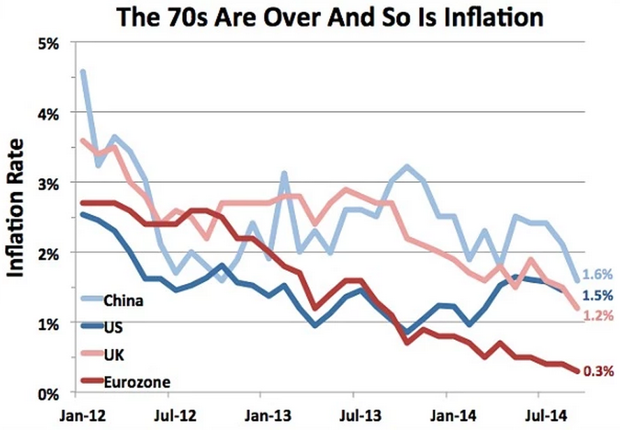 You can see that above. Inflation is just 1.6 percent in China, 1.5 percent in the U.S., 1.2 percent in the U.K., and a minuscule 0.3 percent in the Eurozone. Then there’s Japan, which is harder to compare since its sales tax hike just bumped up prices, but would only have 1.1 percent inflation, if not for that. And it’s probably even lower than that there and everywhere else. That’s because, as Jessie Handbury, Tsutomo Watanabe, and David Weinstein show, measured inflation tends to overestimate actual inflation by about 0.6 percentage points. So inflation might really be about 1 percent in all of the world’s biggest economies.