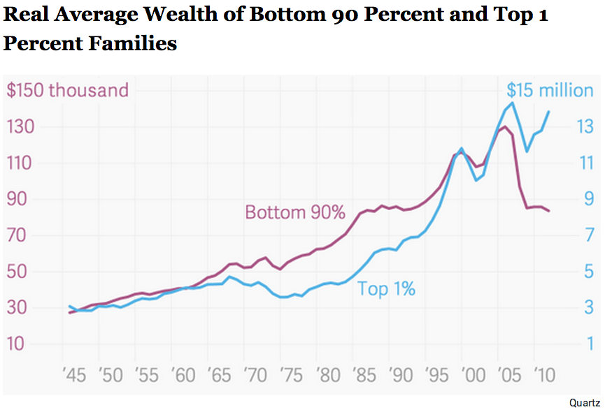 The two economists used tax data to build the most complete picture to date of U.S. wealth. Their findings are worrisome. Today, the top 0.1 percent of Americans—about 160,000 families, with net assets greater than $20 million—own 22 percent of household wealth, while the share of wealth held by the bottom 90 percent of Americans is no different than during their grandparents’ time. What does this look like at the household level? Perhaps the most striking chart produced by the economists’ efforts to measure U.S. wealth is the one [above], which shows that after a long march upward, and then a steep decline, the “average real wealth of bottom 90 percent families is no higher in 2012 than in 1986.” Meanwhile, the top 1 percent of wealthy families has almost completely recovered from the ill effects of the financial crisis.