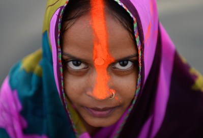 An Indian Hindu devotee poses for a photograph as she offers prayers a day ahead of the Chhat festival on the Yamuna river in New Delhi on October 28, 2014. The Chhat festival is dedicated to Lord Surya (Sun), Agni (fire) and Lord Kartikeya or Muruga. Devotees fast during the day and in the evenings offer Chhat to the setting sun in bodies of water. AFP PHOTO / CHANDAN KHANNA (Photo credit should read Chandan Khanna/AFP/Getty Images)