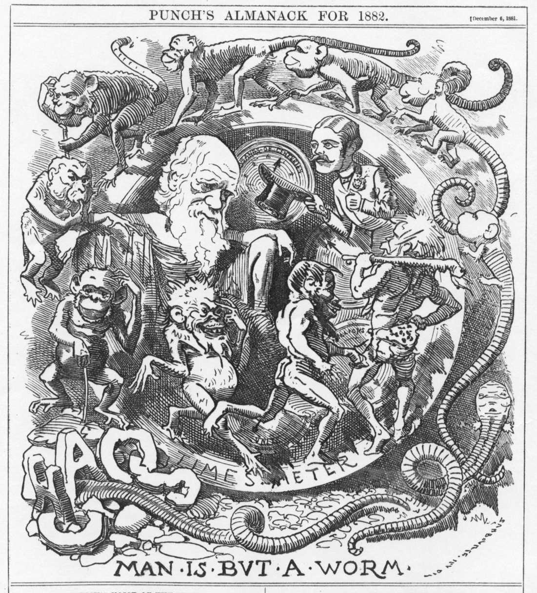 (Image: Punch’s almanac for 1882, published shortly before Darwin’s death, depicts him amidst evolution from chaos to Victorian gentleman with the title “Man Is But A Worm,” via Wikimedia Commons)