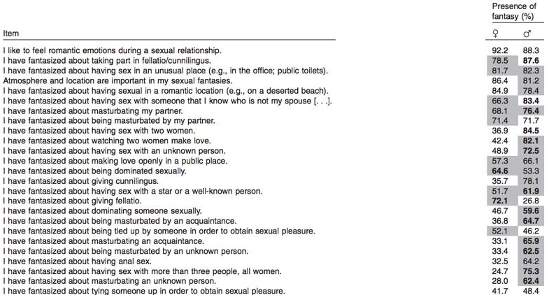 Researchers from University of Montreal presented 799 men and 718 women—85.1 percent of whom identified as heterosexual, 3.6 percent homosexual, and 11.3 percent somewhere in between—with a long list of statements regarding fantasy scenarios, asking them to rate their agreement with each on a scale of one to seven. Anything rated over three was counted as a fantasy.