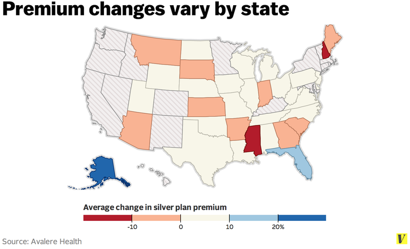 But those averages mask huge variation. Average silver premiums are falling by 18 percent in New Hampshire — but increasing 28 percent in Alaska. There are two states where average premiums are going up by more than 10 percent (Alaska and Florida) and two where they’re dropping by double digits (Mississippi and New Hampshire).