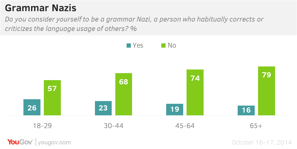 Research conducted by YouGov in October shows that, when asked, 21% of Americans consider themselves to be what is colloquially known as a ‘grammar Nazi’, that is someone who habitually corrects or criticizes the language usage of others.