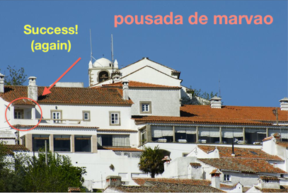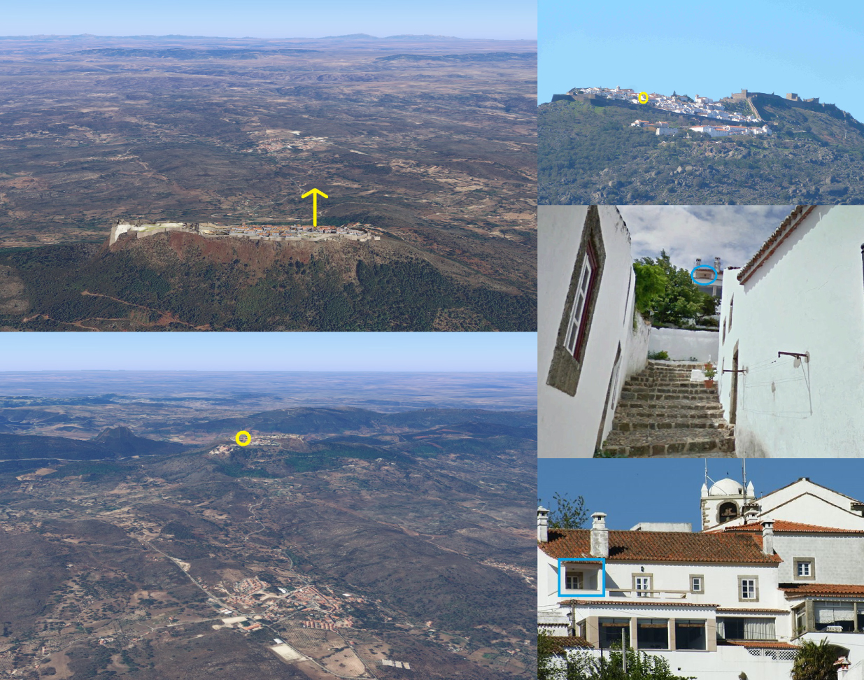 My first inclination was to search Spain given something about the landscape. I have spent a fair amount of time in Spain searching for other windows. Instead I bounced around Mediterranean countries looking for elongated, red roof tiles and eclectic chimneys similar to those in the contest view. The closest I found was the fortified town of Monsanto in Portugal. It had similar roofs, chimneys, as well as large boulders and outcrops. This prompted a search for Medieval fortified towns of Portugal on high promontories (appropriate for the soaring swifts in the contest photograph). A photograph of Marvão caught my eye because it included the distinct chimneys in the contest view. It was then obvious that the dark brown chimney to the right was, instead, a guard tower on town’s fortification walls. All other clues check out.