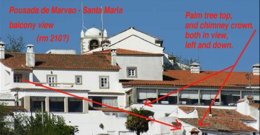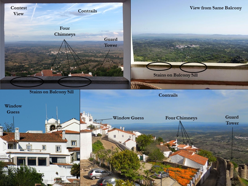 Once I found the hotel, it became clear that the contest view was from a balcony and not a window. There were no signs of glass or window framing or fixtures. Photographs from a balcony at Pousada de Marvão had much the same view and identical stains on the granite balcony sill as those barely visible in the contest photograph (see illustration). It is a fairly small balcony on the corner of one of the hotel’s cobbled-together appendages and can be seen in photographs of the hotel’s northeastern façade (see illustration). Based on guest reviews of the hotel, the room is probably #312 (said to be a small room with balcony). Room 310 is over the kitchen which is located northwest of the contest balcony with space for #311 between them. Number 311 is a double room with a terrace balcony which is also visible on the building’s façade.