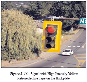 retroreflective tape on the backplates of signals at six intersections on an arterial in Saanich (36). The authors hypothesized that the framed signal heads would be more visible to motorists at night and the safety of the intersection would improve. Figure 3-16 shows a daytime photograph of a signal head with the high intensity tape around the backboard.