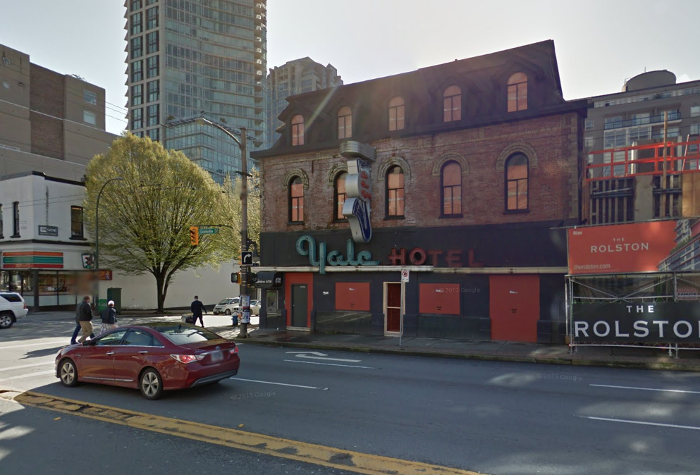 The heritage building in the foreground is the old Yale Hotel, one of Vancouver’s oldest and most distinct buildings: “The historic building was built in 1888, when the City of Vancouver was just two years old. The Yale’s red brick façade, mansard roof and neon signs make it one of Vancouver’s most distinctive buildings.” For many years The Yale housed a famous, world-class blues club which is now closed, but the building just underwent an extensive historical renovation as part of a condo project (everything in Vancouver these days is a condo project).