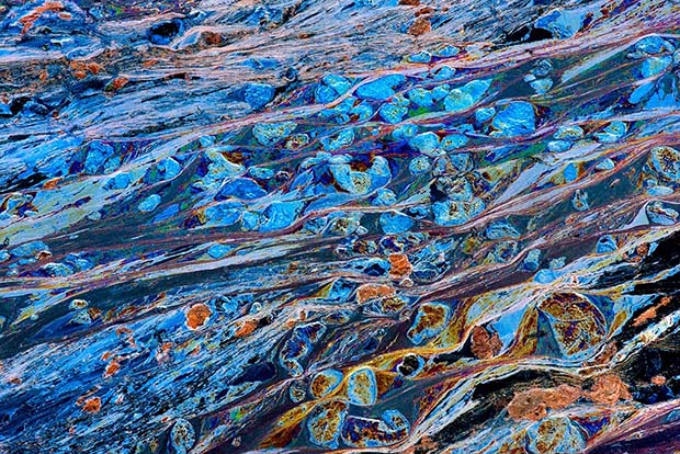 Searching the surface of the water, he discovered a different kind of picture-esque canal. Wearing a mask to protect himself from the fumes, Hirsch creates a disorienting view of what is at once toxic and seductive. Hirsch’s psychedelic abstractions find beauty in an otherwise ugly environment. He compresses the depth of the canal into flat, two-dimensional palates of color. The complexity of colors, shapes, and textures on the water’s surface take on a galactic-like appearance, offering what might be a glimpse into another universe. In reality, these vivid palates are found in our own backyard.