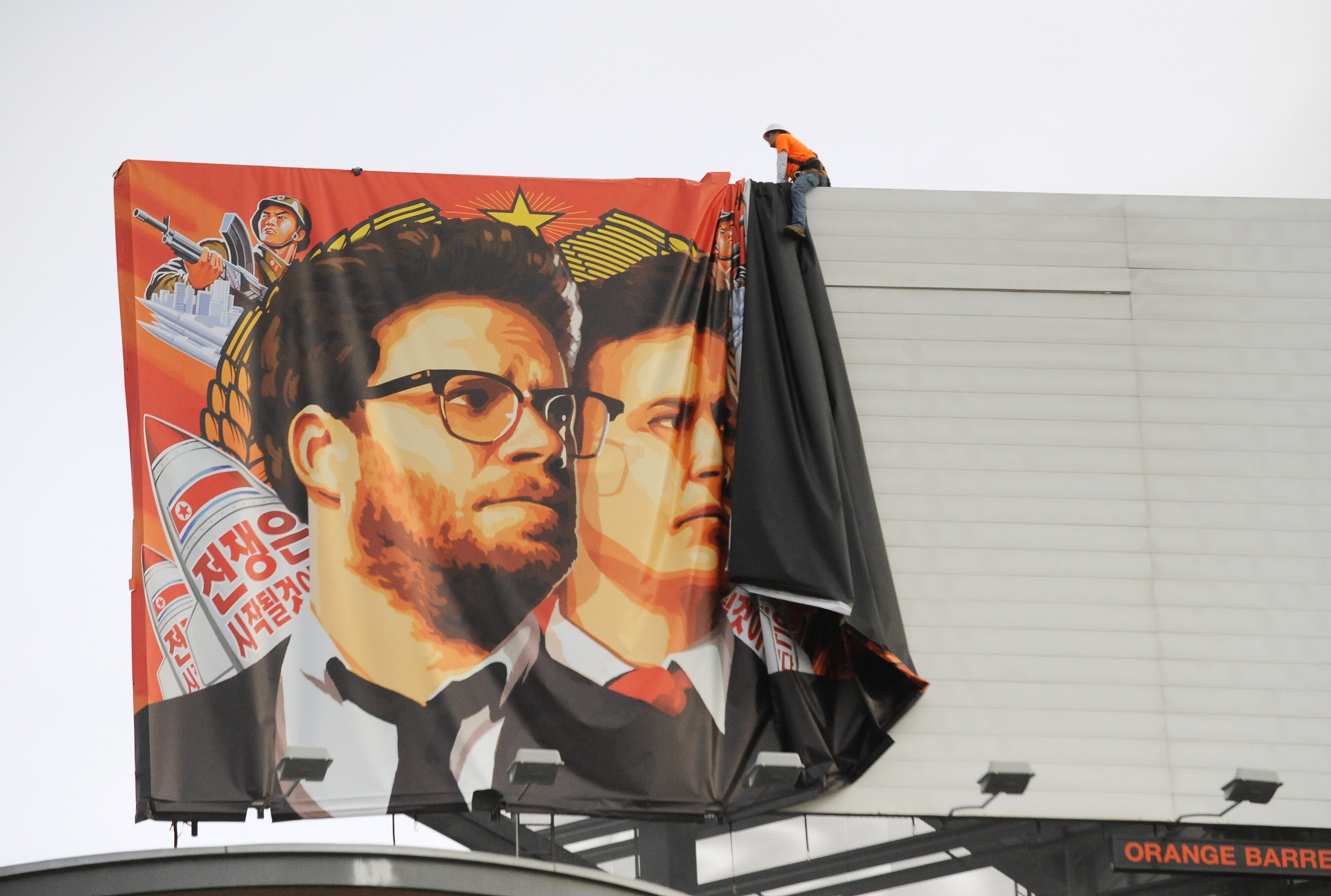 (Photo: Workers remove a poster-banner for The Interview from a billboard in Hollywood, California, on December 18, 2014, a day after Sony announced it was canceling the movie’s Christmas release due to a terrorist threat. By Michael Thurston/AFP/Getty Images)