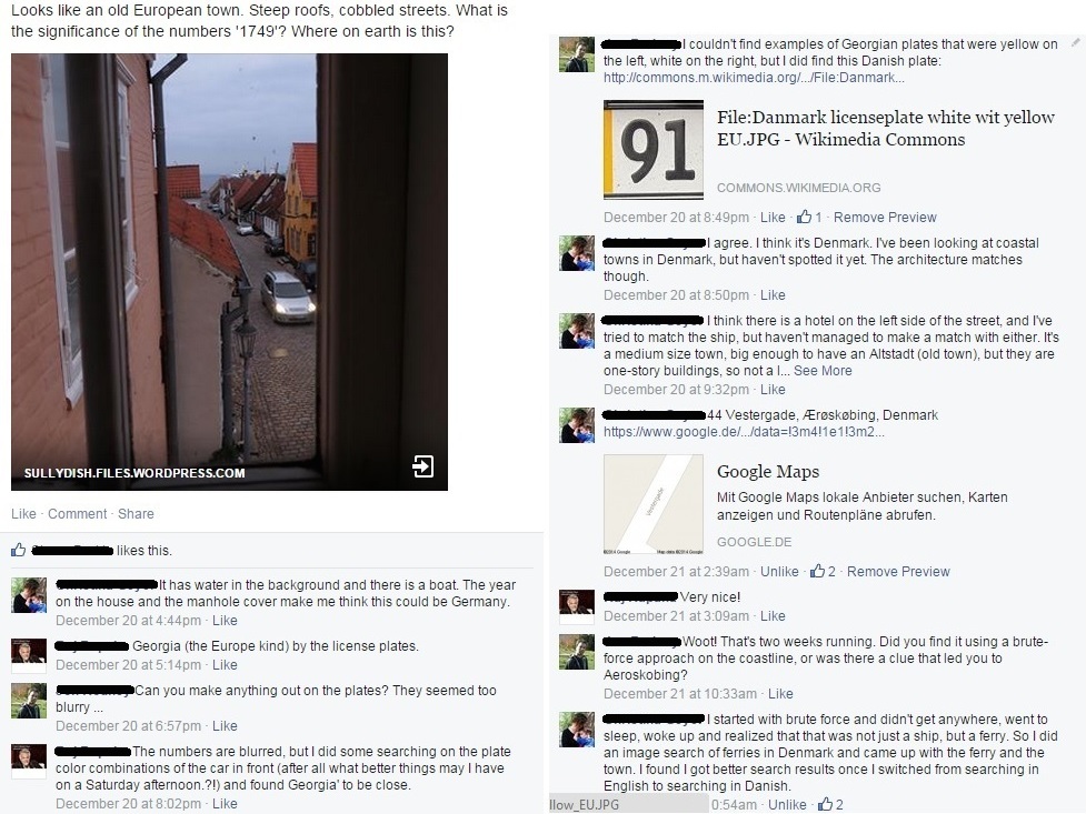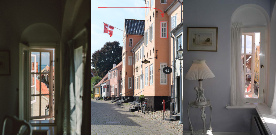 My process: My parents having unprotected sex could be seen as the first step in figuring this out. However, I do think it would be more correct to say that my being born into a family of sailors in another small coastal town in Denmark was the first and very important step in guessing the window. Second step was immediately recognising the view as an old Danish coastal town. Since they all pretty much look the same, I was very happy to notice the top of the ferry in the background, which narrowed it down quite a bit. The first place I thought of was Ærøskøbing. I looked at google maps and Vestergade is the only street leading to the ferry. I randomly clicked streetview on Vestergade and ended up in front of the yellow house from 1749. And that was pretty much it. Also, there’s a photo of the window on the hotel website.