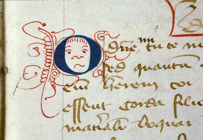 Usually medieval illustrations look quite different from those in modern comic books. This one, however, breaks with that rule: it is almost 600 years old, yet it looks like it was drawn yesterday. It shows a stereotypical comic book expression, of a pseudo-offended person. The spiky hairdo adds to the eerily-modern look of this funny face. Zoink!
