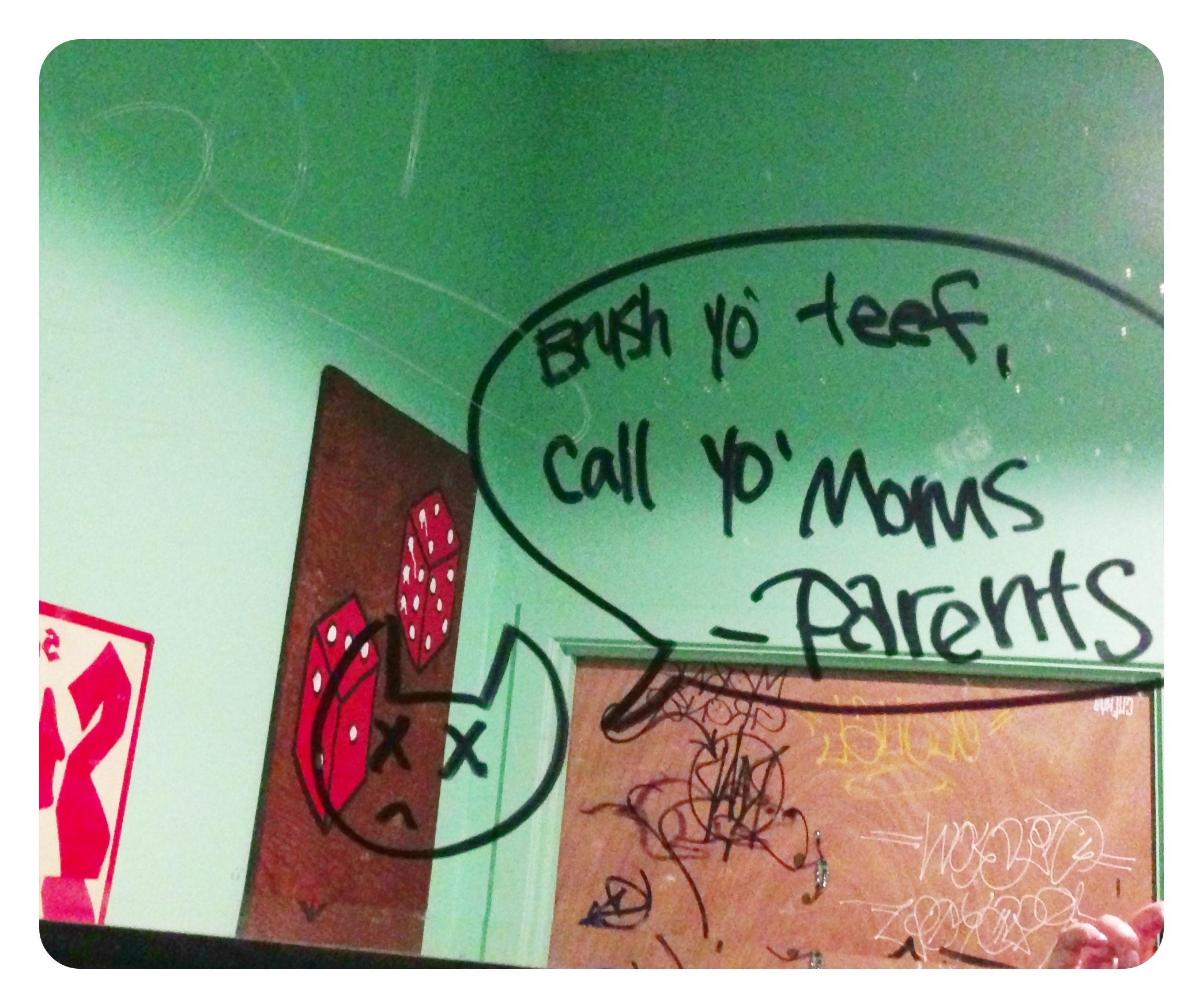 Another sends the above photo: “Here is my favorite from a mirror at Telegraph Beer Garden in Oakland, from ‘parents'”. Another reader: