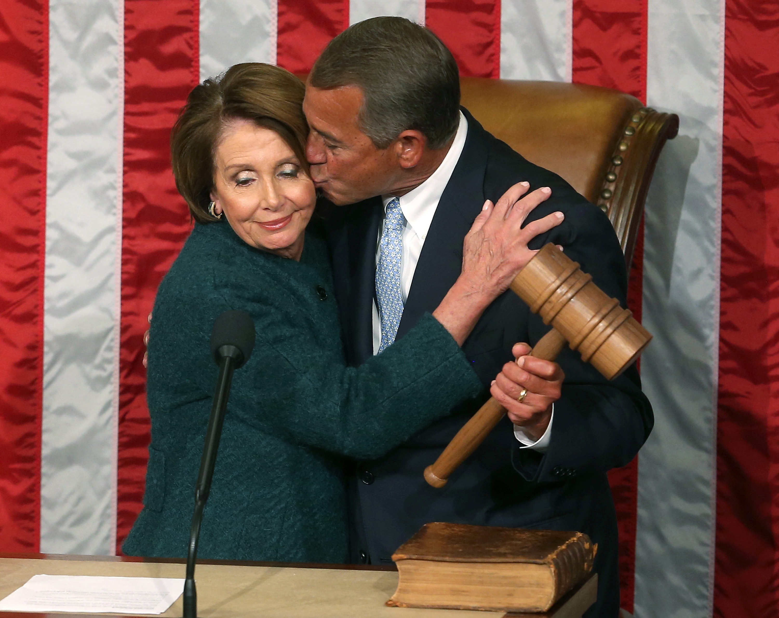 House Minority Leader Nancy Pelosi (D-CA) hands Speaker of the House John Boehner (R-OH) the speaker’s gavel during the first session of the 114th Congress in the House Chambers January 6, 2015. Boehner maintained his speakership but with two dozen House Republicans voting against him. Today Congress convened its first session of the 114th Congress with Republicans controlling both the House and Senate. By Mark Wilson/Getty Images. Update from a reader:
