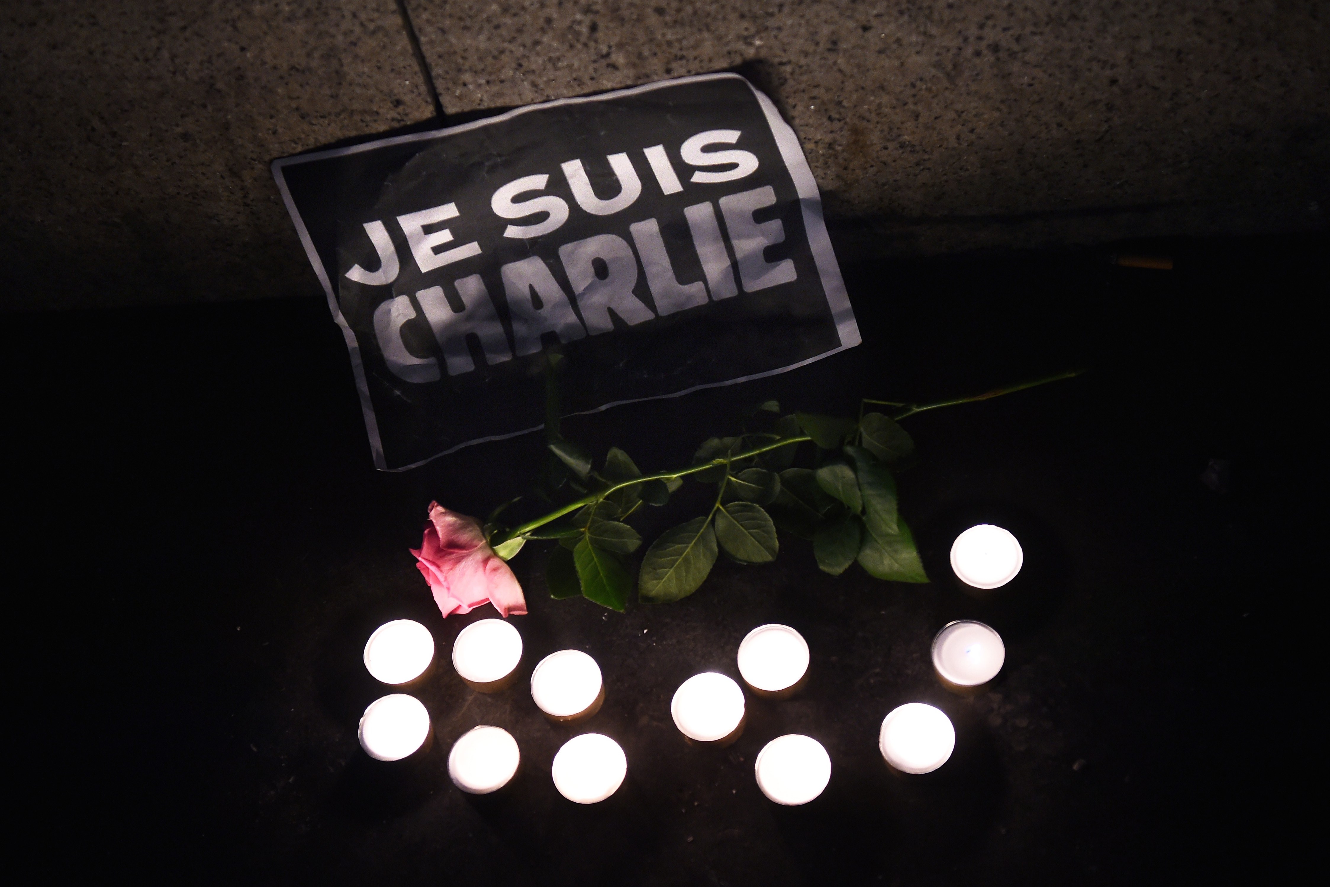 (Photo: Candles, a rose and a sign that reads in French “I am Charlie” are placed on the ground as people hold a candle lit vigil at the Old Harbour in Marseille, on January 7, 2015, following an attack by unknown gunmen on the offices of the satirical weekly, Charlie Hebdo. France’s Muslim leadership sharply condemned the shooting that left at least 12 people dead as a “barbaric” attack and an assault on press freedom and democracy. By Anne-Christine Poujoulat/AFP/Getty Images)