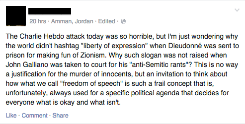 Indeed, many Muslims on social media are wondering why free speech seems a bit freer than usual when Islam is the target. One such Muslim is a Jordanian friend of Dish editor Jonah Shepp, who didn’t want to reveal her name: