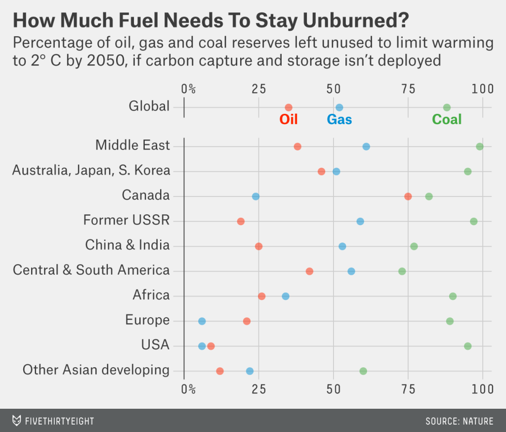Christie Aschwanden reads through a new study which “shows, in the finest detail yet, which fossil fuel reserves can be exploited and which should remain untouched if we’re to have at least a 50 percent chance of meeting the 2-degree limit”: