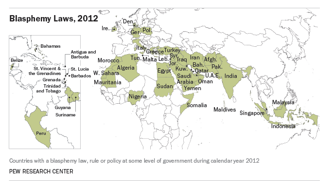 The map above from the Pew Foundation shows where blasphemy laws are on the books. See a pattern here? Pew notes that 64 percent of the world’s populations still live under blasphemy laws and they are marginally more common than the other deeply anti-Enlightenment prohibition on apostasy.