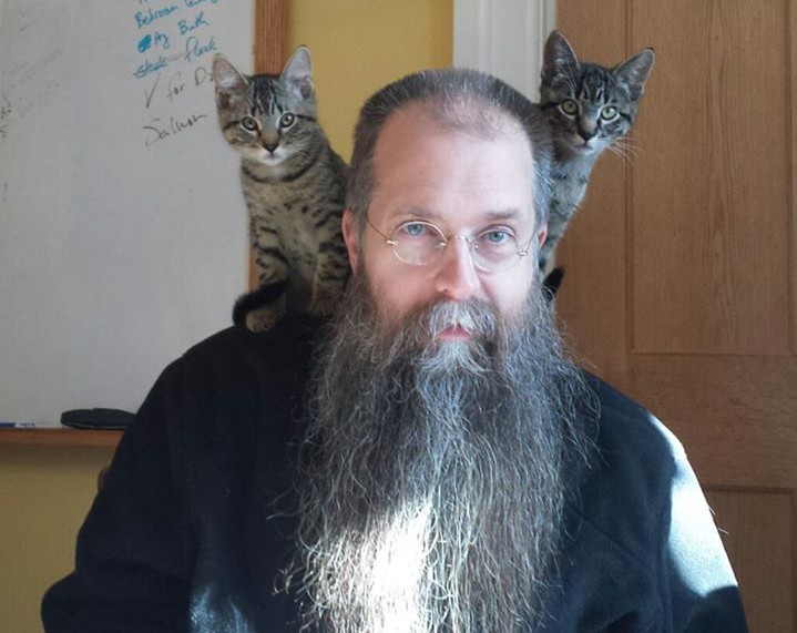 I submit as a candidate this photo of my friend, snapped by his wife, both of Northfield, Minnesota, with kittens Cosmo and Bartimaeus. She titled this photo “things are taking a turn for the strange today”. He and I are all among a group of folks who play Nordic Traditional music here in Northfield on Monday nights at the Contented Cow Pub. We have been playing together for 10 years and I like to think we are the best and largest nordic traditional music jam session west of Bergen. People have to keep warm here in Minnesota somehow when the nights are 14 below.