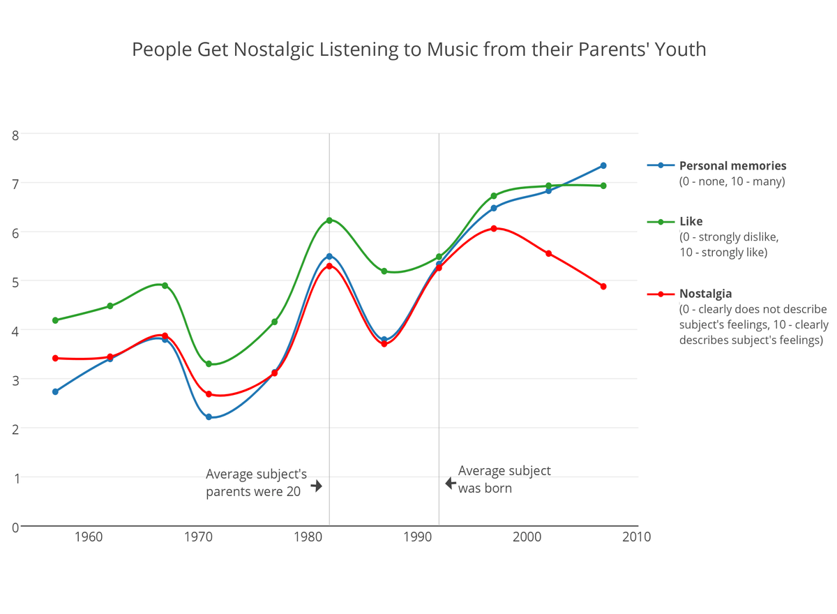 And there’s another bump in attachment, preference, and nostalgia for music that was popular in the 1960s. Although researchers mention that this music might just be higher-quality and thus have stayed in the popular listening repertoire longer (earning the label “classic rock”), they also say this bump could be the product of grandparents’ influence, either directly or through the parents, on the subjects’ listening habits and music-associated memories.