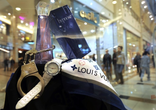 A counterfeit Louis Vuitton scarf, Lancome perfume and Chopard wristwatch are displayed at an exhibition of counterfeit goods of famous trademarks in the Bulgarian capital Sofia on March 16, 2011. Bulgaria’s customs agency seized in 2010 a total of 2.5 million goods with breached trademark rights. AFP PHOTO / NIKOLAY DOYCHINOV (Photo credit should read NIKOLAY DOYCHINOV/AFP/Getty Images)
