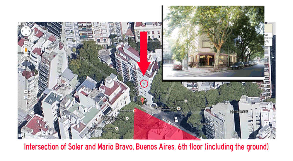 First-time entrant, long time astonished observer here. I think this was taken from the fifth-floor window (fourth-floor in European counting, i.e. ground+4) of the building on the corner of Mario Bravo and Soler in Buenos Aires (3600 Soler? Can’t figure out an exact address), on the five-way intersection of Soler, Honduras, Mario Bravo, and Coronel Diaz.