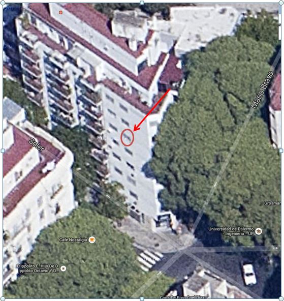 My best guess is that the picture was taken from an apartment building with the address “De la Carcova 3501-3599” in the Palermo section of Buenos Aires. The view looks due north from the fifth floor across Soler towards Avenida Coronel Diaz.