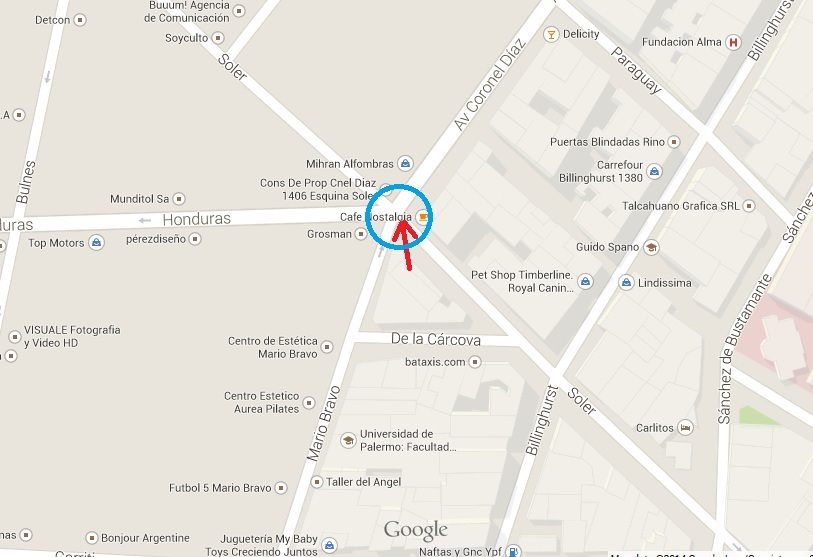 5. Using both the bus line website and Googlemaps, locate the slight turn (a right turn!) on from Avenida Coronel Diaz, across Soler, onto Honduras that appears to fit the bill… Yay!