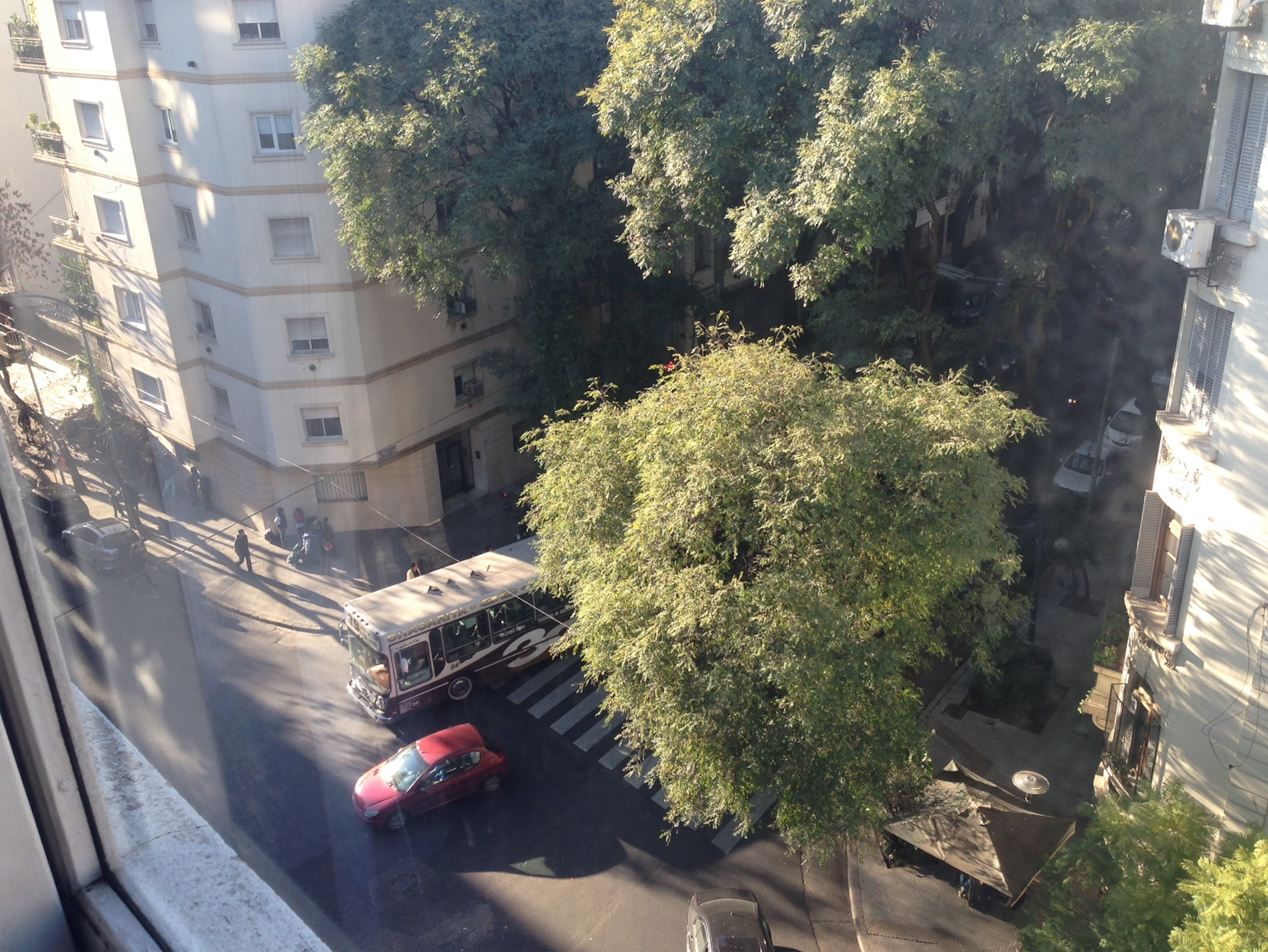 I’m not super familiar with Buenos Aires, but based on the fact that the bus is turning right and on the tree-lined street, I’m guessing Avenida Santa Fe in the (trendy!) Palermo district, taken at the intersection of Santa Fe and Vidt. From a 5th-floor window in the building on the northeast side of the street.