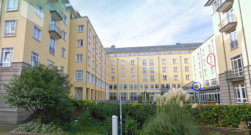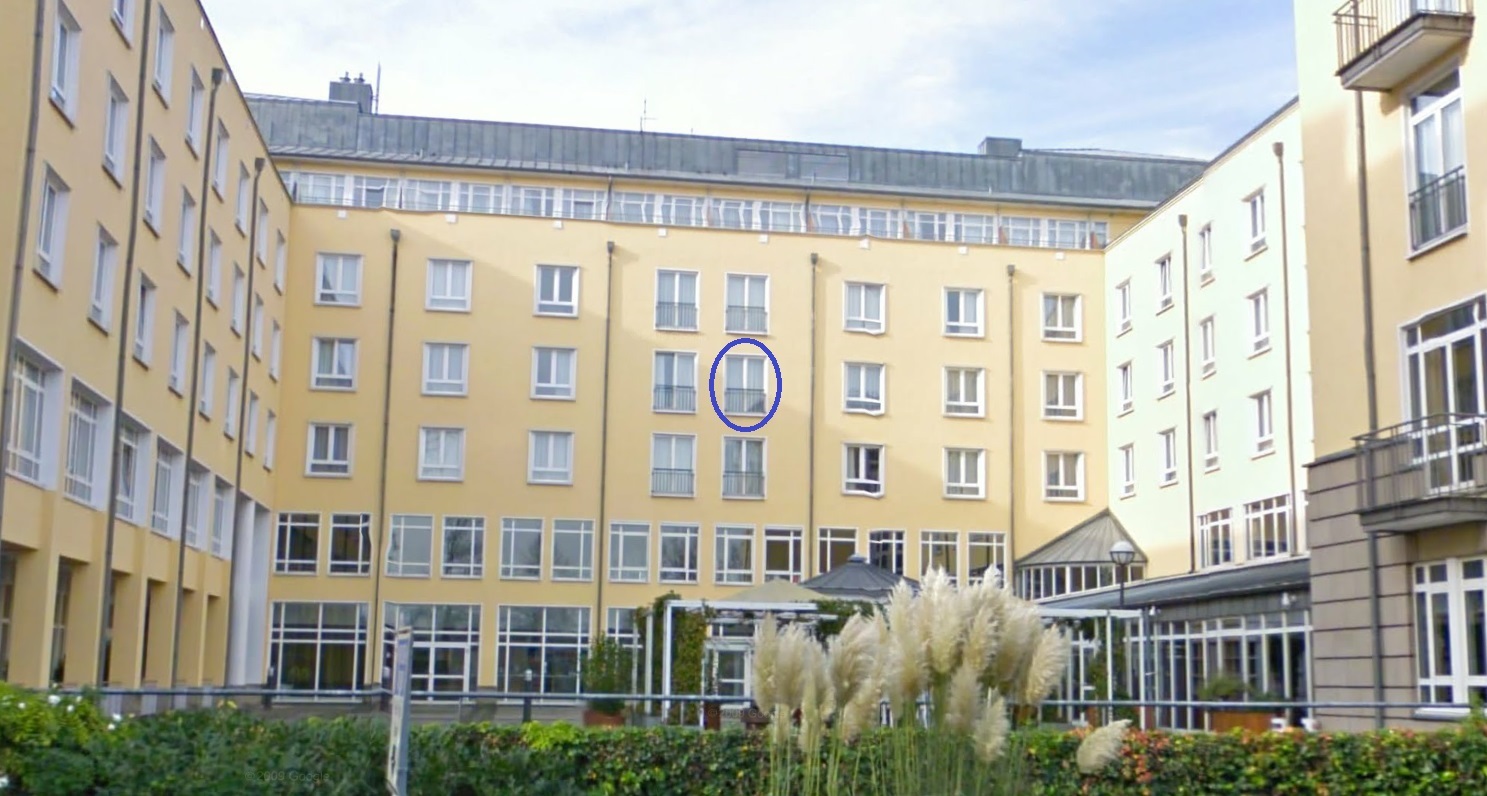On the second floor of the building, there are two large windows that open onto small balconies. I believe the contest window is the one on the left when facing the building (i.e. the one further south). The window is in the box in the attached picture. I also attach one street view picture showing a snowy version of the same scene, but just from one floor down. And for good measure attached is a third picture taken from the parallel street across the Arriu Nere showing the building with the contest window and two of the buildings in the contest picture.