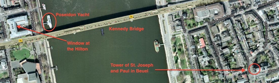 This week’s view comes from Vielha, Spain in the Val D’Aran just a few miles south of the French border. The picture was taken from a sliding living room door on the second physical floor of the Casa Mijaran rental apartments (most likely Mijaran #1) located at 54-52 Carrer Major and looks east-north-east along a heading of 71.37 degrees over the banks of the River Nere, a tributary of the Garonne River. I’ve also attached a picture from the interior showing the likely spot where your viewer was standing.