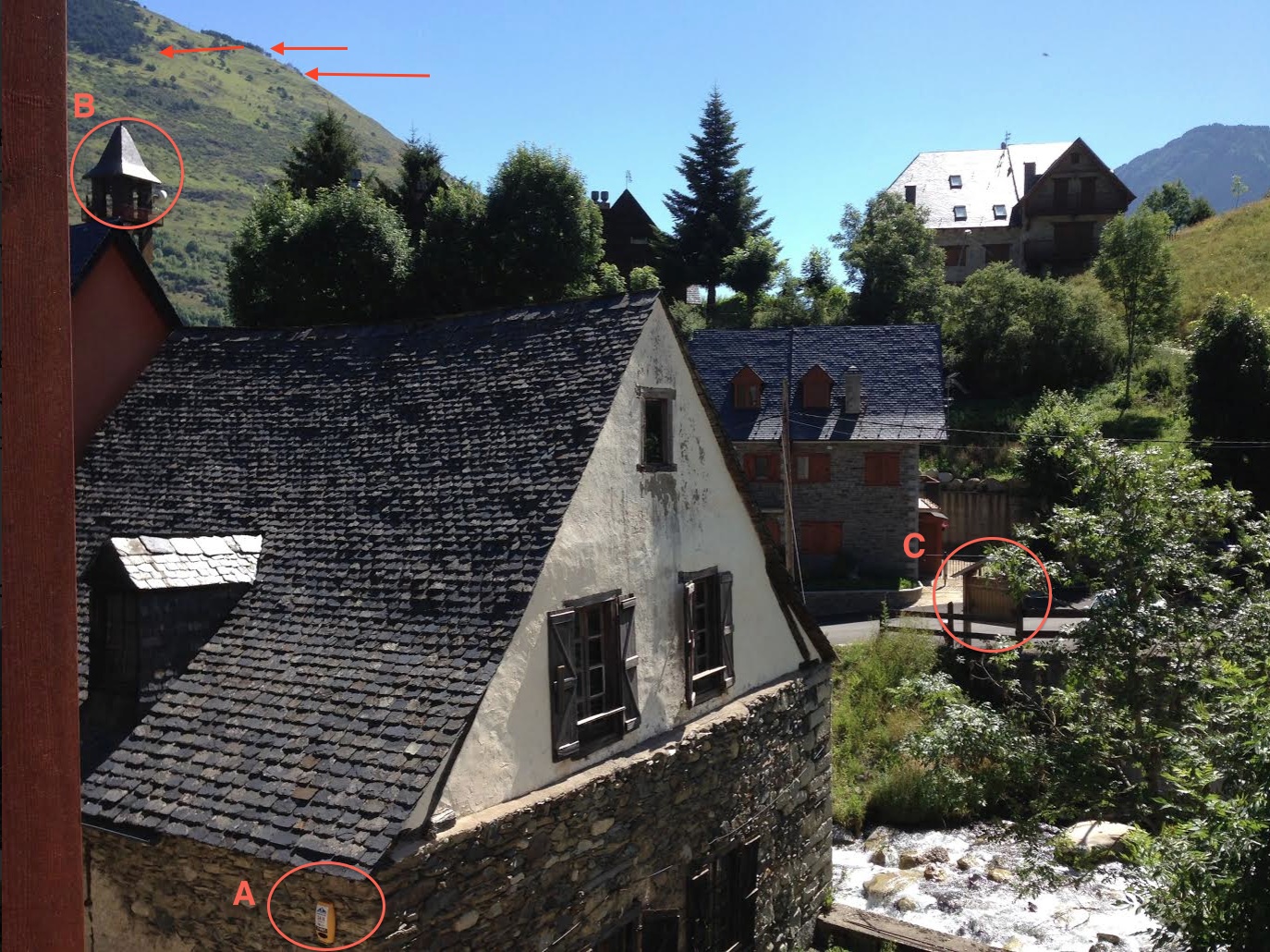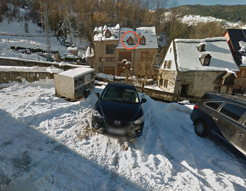 This one was fun. At first the general alpine-ness suggested the Alps, but poking around there didn’t turn up the right mix of architectural features. Cycling fans know that if it’s not the Alps then it’s the Pyrenees, so off to the Franco-Spanish border. The ridgeline matched one outside Vielha, Spain, just a stone’s throw from the French border and familiar to obsessive cycling fans who remember it as the teams’ home base before last Tour de France stage 16.
