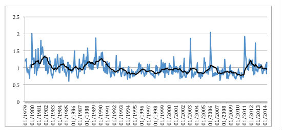 The number of protests each month is divided by the total number of all events recorded in GDELT that month to create a “protest intensity” score that tracks just how prevalent worldwide protest activity has been month-by-month over the last quarter-century (this corrects for the exponential rise in media coverage over the last 30 years and the imperfect nature of computer processing of the news). To make it easier to spot the macro-level patterns, a black 12-month moving average trend line is drawn on top of the graph to help clarify the major temporal shifts.