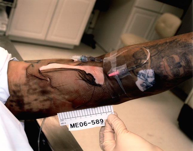 This created large chemical burns. On the right arm, the burn zone was 12 by 5 inches, with numerous blisters (or “bullae,” as they’re known medically) and a sloughing off of superficial skin. On the left arm, the burn zone was 11 by 7 inches. The blisters, according to the autopsy report, were filled with “watery pink-tinged fluid.” By the time the autopsy began, the medical examiner noted there had been “extensive skin slippage,” revealing white and pink subcutaneous skin.