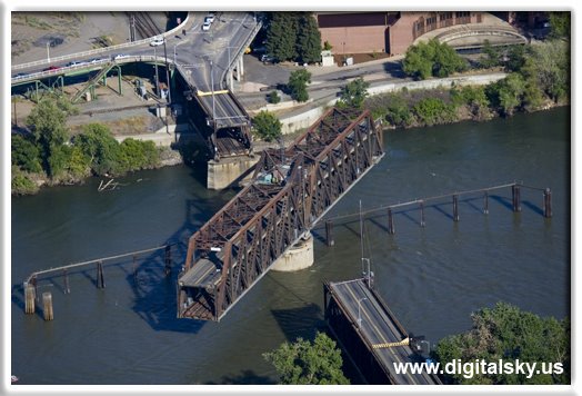 IGotOneIGotOneIGotOne! As all the train-and-bridge spotters have figured out, a Google search of “railroad swing bridge double” served up the “I” Street bridge in Sacramento lickety quick, and maps revealed the 100 Waterfront Place building. I’m sure the pros have already sussed out the latitude, longitude, elevation, time of day, temperature, paint color, bar menu, beagle population and average beard length of the neighborhood, and then taken the rest of the afternoon off for beer and volleyball. They can have it; i’ll just bask in the satisfaction knowing I beat one of these things.