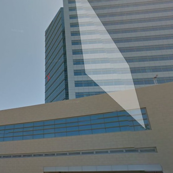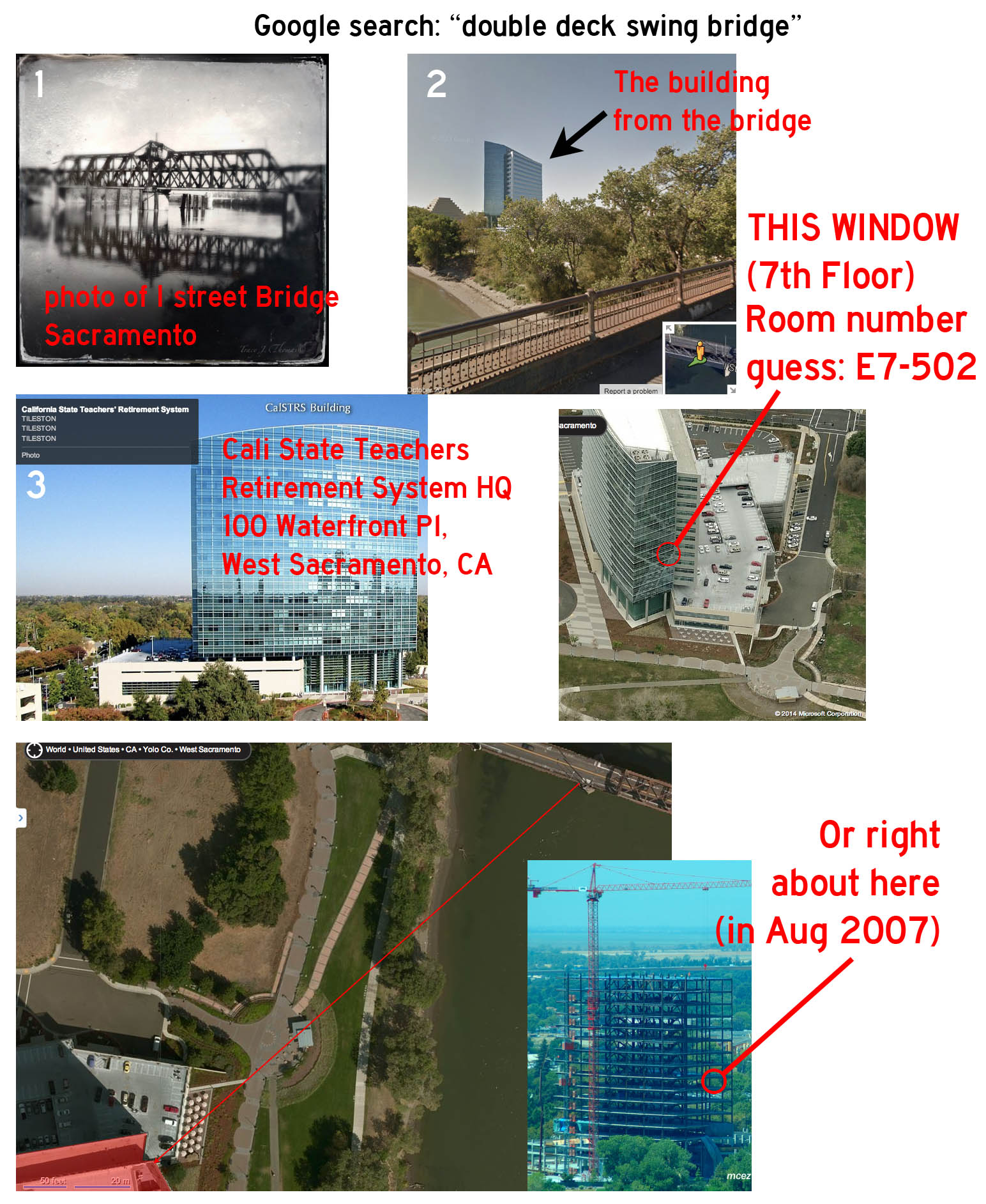 From there, identifying the building the window is in was as easy as falling off a piece of cake: California State Teachers’ Retirement System, at 100 Waterfront Pl in West Sacramento, California. This modified Google Earth view shows the angle of the photograph indicating roughly where the window is.