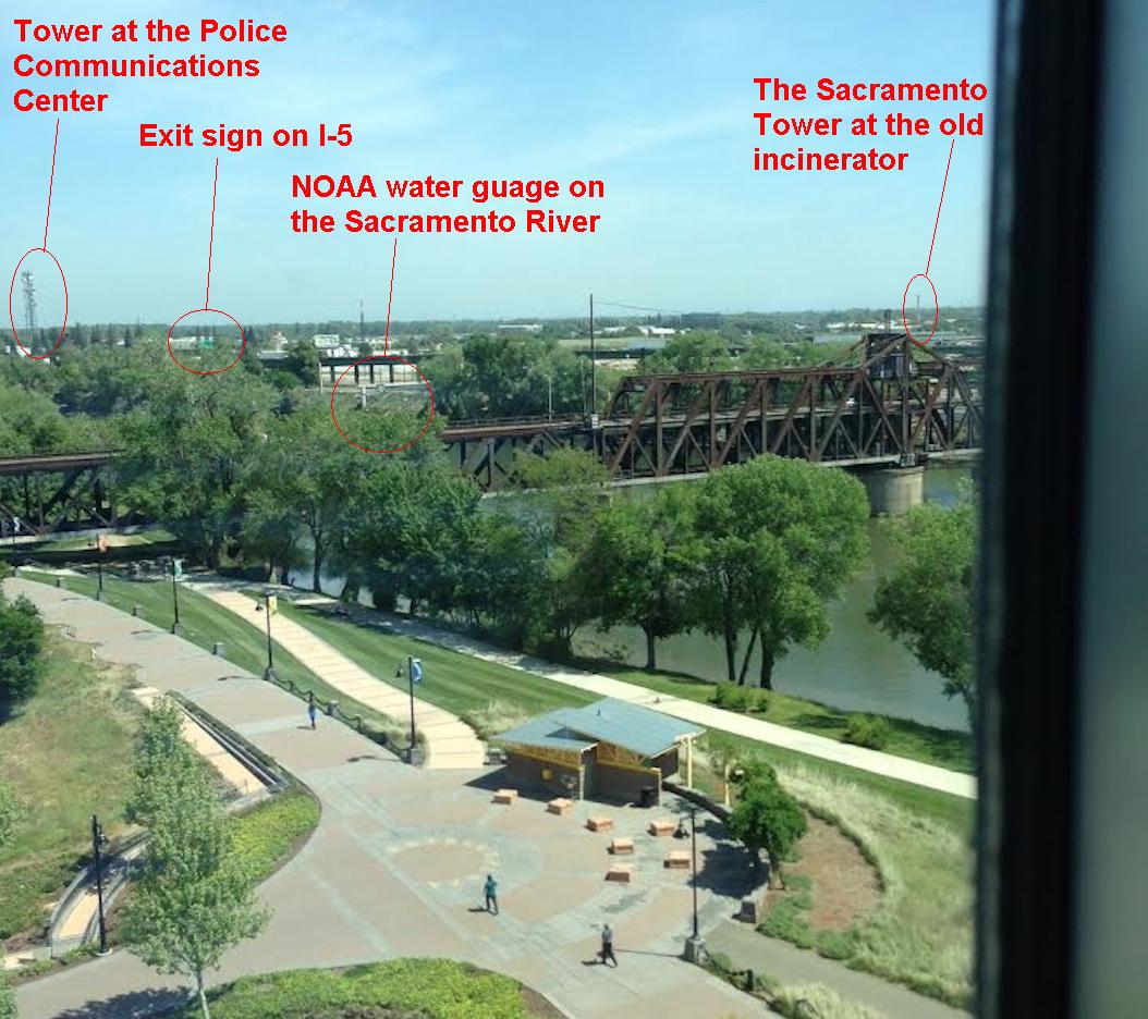 Several peculiar items can be seen in this week’s picture. First, the large tower on the left side of the picture is part of a police communications center. Watch one of the dishes being removed here. Second, in the middle of the picture there seems to be a pipe climbing out of the berm across the river. It turns out to be one of NOAA’s numerous water gauges that monitors river crests and flooding. Third, the faint smokestack on the right hand side of the picture is the Sacramento Tower. Built over a hundred years ago at the city incinerator, it was climbed for the first time by a local rock climber. He dedicated his ascent to the Americans taken hostage by Iran. Slightly odd and inefficient means of communication, but I’m sure the hostages appreciated the gesture.