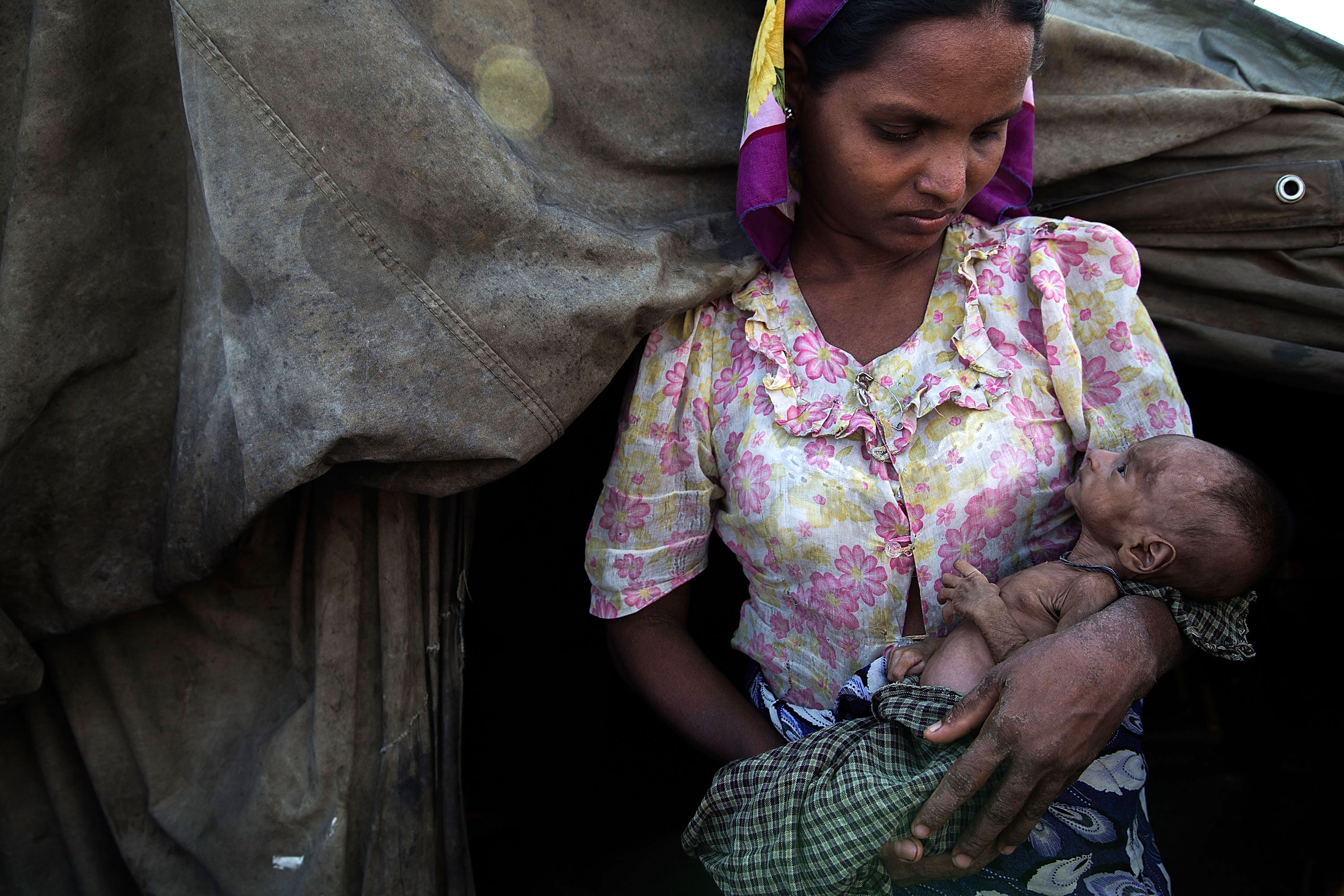 (Photo: Rosheda Bagoung holds her malnourished child outside a tent at Dar Paing refugees camp on May 10, 2014 in Sittwe, Burma. 150,000 Rohingya IDP (internally displaced people) are currently imprisoned in refugee camps outside of Sittwe in Rakhine State in Western Myanmar. Medecins Sans Frontieres (MSF), the primary supplier of medical care within the camps, was banned in March by the Myanmar government. Follow up attacks by Buddhist mobs on the homes of aid workers in Sittwe put an end to NGO operations in the camps. Though some NGOs are beginning to resume work, MSF remains banned and little to no healthcare is being provided to most Rohingya IDPs. One Rohingya doctor is servicing 150,000 refugees with limited medication. Several Rakhine volunteer doctors sporadically enter the camps for two hours a day. Births are the most complicated procedures successfully carried out in the camps. Requests to visit Yangon or Sittwe hospitals for life threatening situations require lengthy applications and are routinely denied. Malnutrition and diarrhea are the most widespread issues, but more serious diseases like tuberculosis are going untreated and could lead to the rise of drug resistant tuberculosis. By Lam Yik Fei/Getty Images)