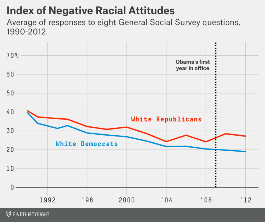 So yes, there does seem to be a slight partisan aspect to racist attitudes in the Obama era. But it is not that big, and the general trend lines over the longer term are positive. What I’m grappling with is whether my own confirmation bias is blinding me to the persistence of truly base racism in American society. I can remember only two instances in my adult life when someone said something to me foully racist. One was when someone observed that in Provincetown, there was no crime because “there aren’t any blacks.” I ended that conversation at that point. Another was a long-ago one-night-stand which in the end lasted only a few minutes. We were back in this dude’s apartment and he was cussing the cable service he had. Then he started going off on the African-American men who had installed it. “Worthless niggers,” he said in a tone that stopped me dead. I left.