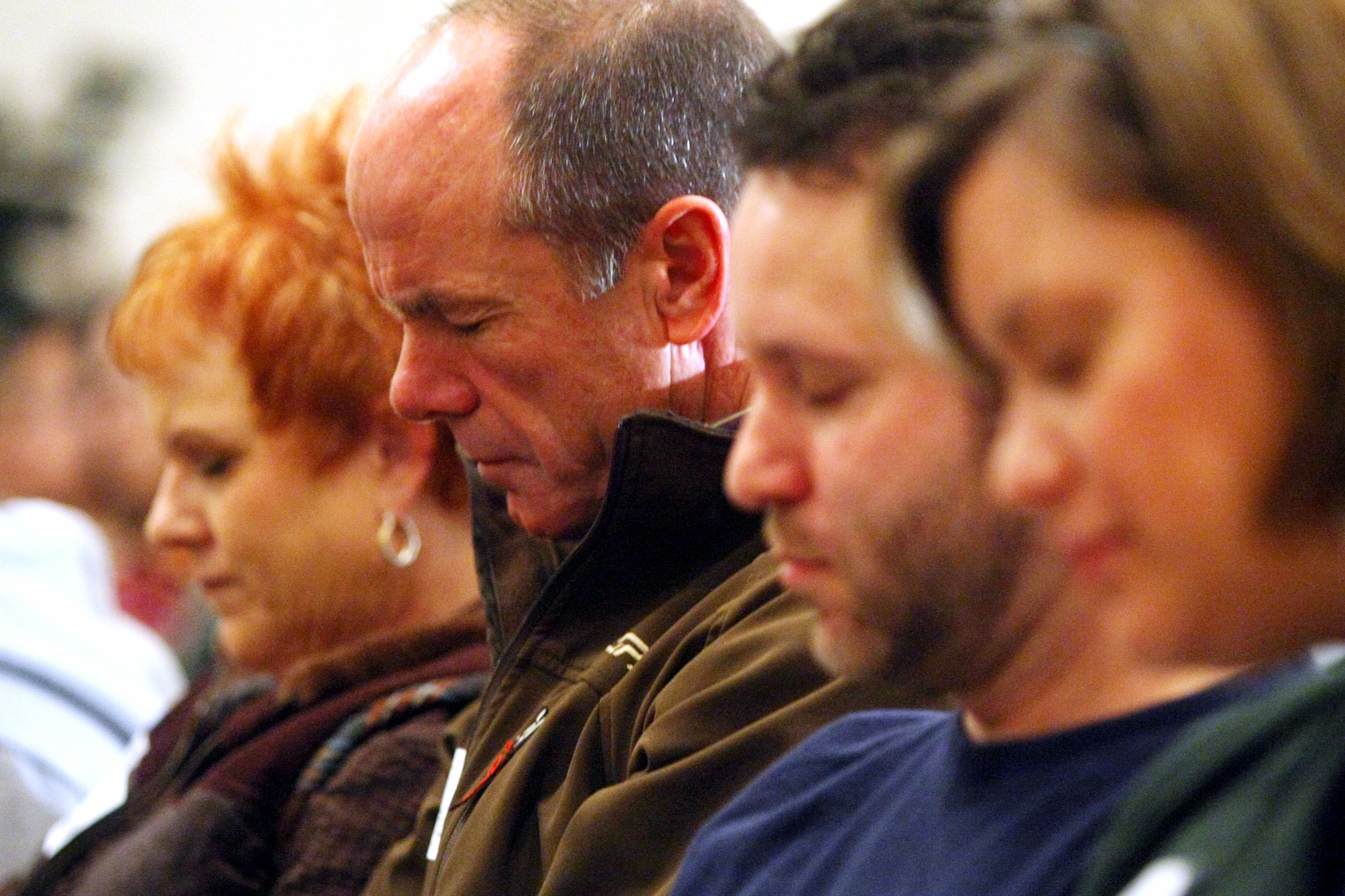 Fargo area residents pray during a non-denominational prayer service March 29, 2009 in Fargo, North Dakota. As flood waters from the Red River began to recede in Fargo and the surrounding communities residents believe that the worst of the flooding may have past, but are being cautioned by state and local authorities not to let down their guard yet. By Daniel Barry/Getty Images.