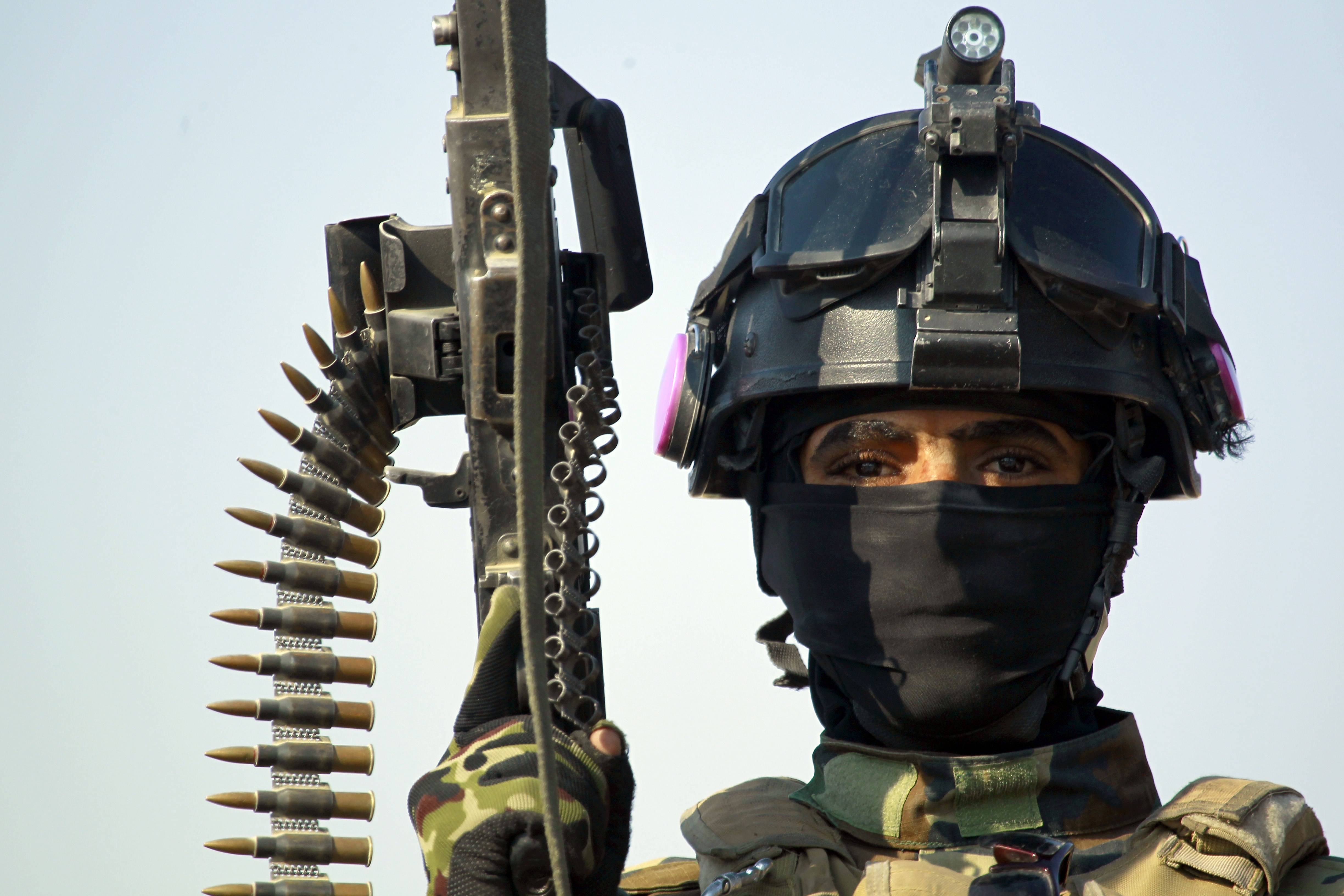 A member of the Iraqi police special forces holds his weapon as he rides a car during a parade in Iraq’s holy city of Najaf before heading to fight Islamic State (IS) group jihadists on November 19, 2014. The previous week Iraqi forces broke a months-long siege on the nearby Baiji oil refinery, the country’s largest, and joined up with elite troops who had been holding off IS onslaughts for months. By Haidar Hamdani/AFP/Getty Images.