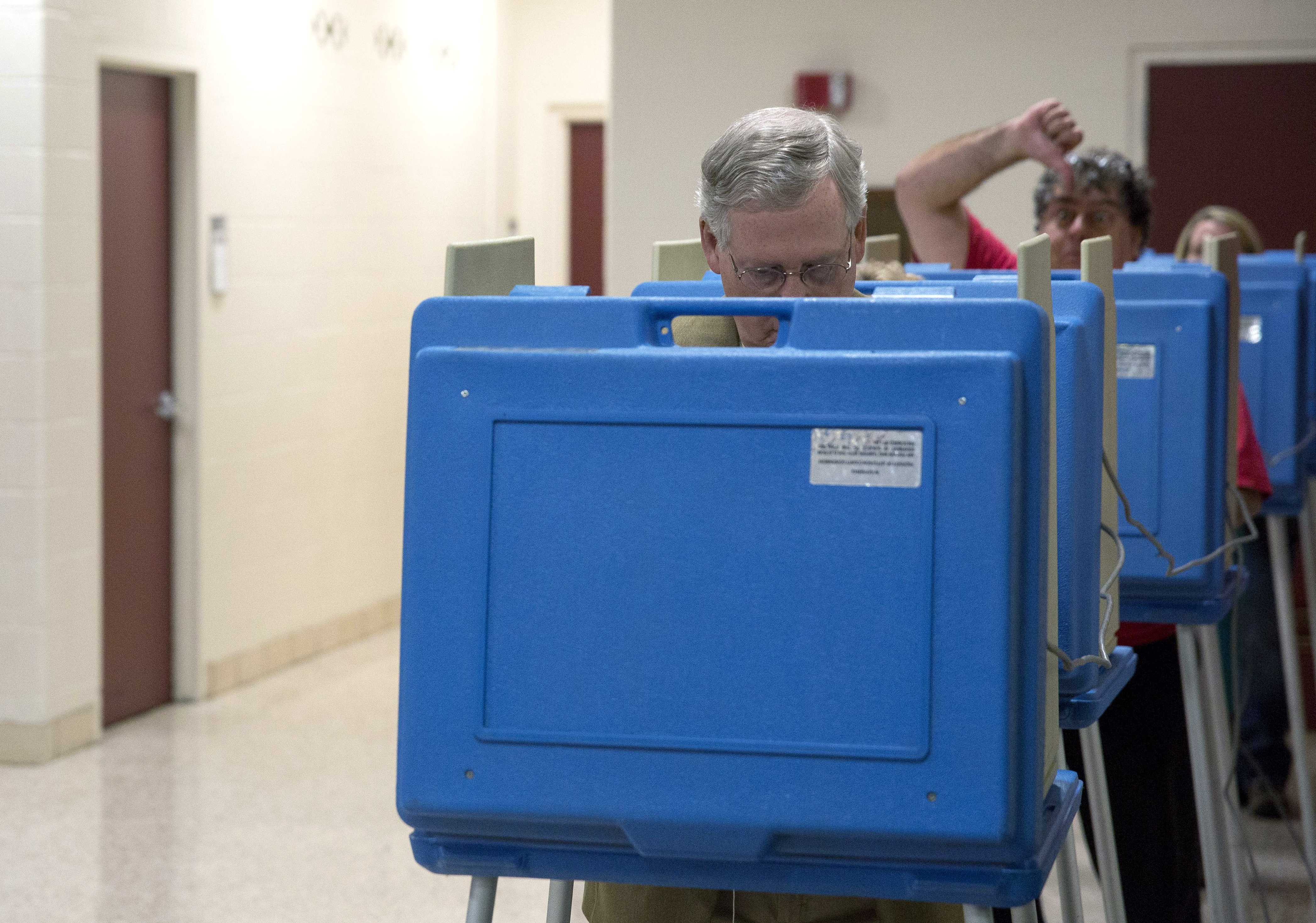 A voter gestures as Senate Minority Leader Mitch McConnell (R-KY) votes in the midterm elections at Bellarmine University in Louisville, Kentucky on November 4, 2014 . McConnell is running in a tight race against opponent Kentucky Secretary of State Alison Lundergan Grimes. By Aaron P. Bernstein/Getty Images.