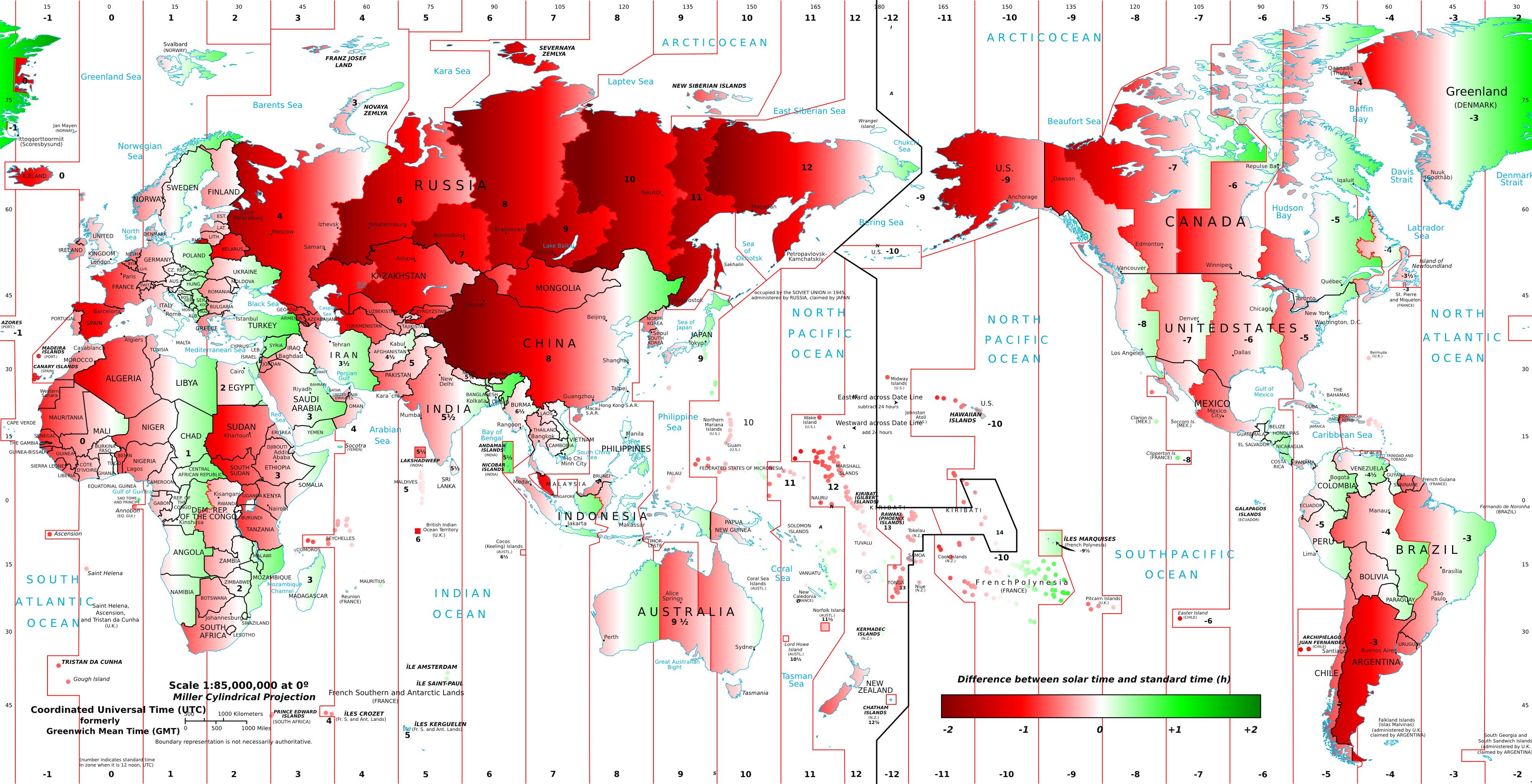The map above, created by math blogger and Google engineer Stefano Maggiolo (click here for a full-size version), shows the difference between clock time and “solar time”—a schedule in which the sun is at its highest point in the sky at exactly 12 noon.