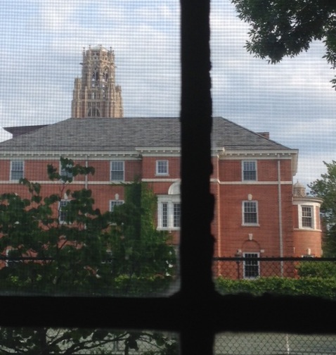 I’m less certain about the exact window, but I believe it’s the left window of the second bay window unit from the left, on the southwest side of the building, on the second story. I chose this one because the perspective of the view appears to correspond roughly to the middle of the building, and since I assume the hinge of this swinging window would be on the wall side of the frame, not the side protruding from the building: