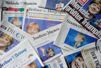 Photos of German Chancellor and Christian Democratic Union (CDU) candidate Angela Merkel are seen on the front pages of German newspapers on September 23, 2013 in Berlin, a day after general elections. Preliminary official results showed that Merkel’s CDU and its Bavarian sister party together won 41.5 percent of the vote — against 25.7 percent for the centre-left Social Democrats (SPD) and 8.4 percent for the SPD’s preferred allies the ecologist Greens.