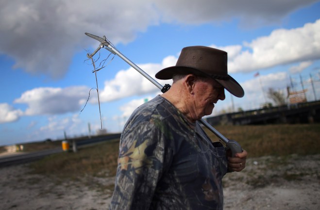 MIAMI, FL – JANUARY 12: BR Slocum carries a snake catcher as he hunts for python’s in the Florida Everglades on the first day of the 2013 Python Challenge on January 12, 2013 in Miami, Florida.The Florida Fish and Wildlife Conservation Commission and its partners launched the month long 2013 Python Challenge to harvest Burmese pythons in the Florida Everglades, a species that is not native to Florida.The contest features prizes of $1,000 for catching the longest snake and $1,500 for catching the most. (Photo by Joe Raedle/Getty Images)