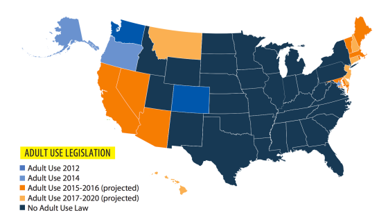 The map has a lot of overlap with the places where the Marijuana Policy Project (MPP), the group that helped launch legal weed in Colorado, already has workers on the ground in preparation for legalization votes over the next two years. Yet MPP is a bit more cautious in its outlook: the group believes 12 states could join Colorado, Washington, Oregon and Alaska in allowing recreational pot by 2017. Unlike ArcView (whose executive director sits on MPP’s board), they’re not banking on legalization taking root in Montana, New Jersey or Connecticut over the next few years, according to spokesperson Morgan Fox. He says they’re concentrating current efforts in Arizona, California, Maine, Massachusetts and Nevada. They see Texas — yes, Texas —as an outside possibility.