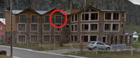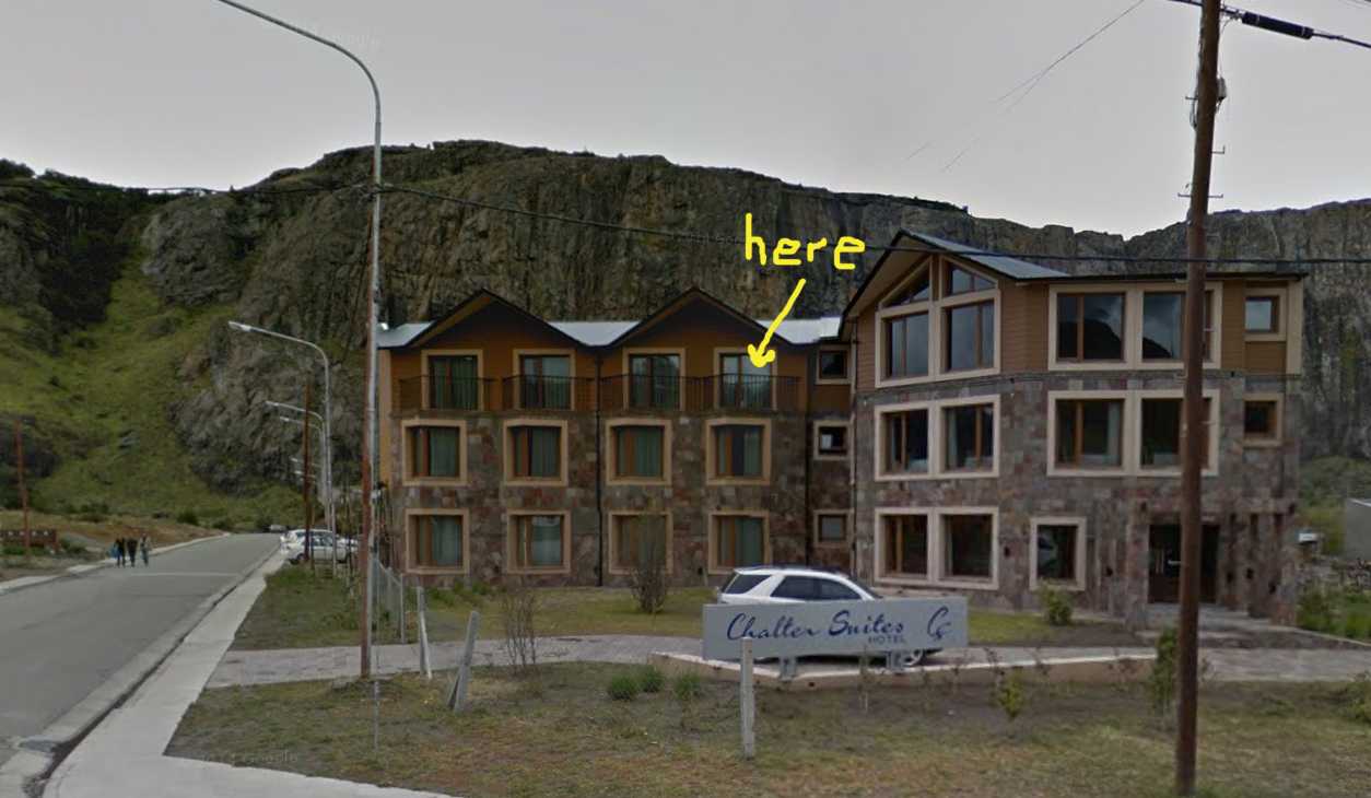 Oh my fucking god, I got it! I’m not the type of person who gets these things, so I think you’ll have thousands of correct answers this week. Something said “Patagonia,” I Googled “patagonia argentina village” and got pics of El Chalten that looked right, decided to look around on Street View and dropped the little man right next to the hotel. The triangulation to find the right window (see pic), figuring out how to draw an arrow on the picture and export it, and composing this email took way, way longer than finding the location. Cleverly, I scribbled a superfluous “here” on the picture in an attempt to get featured: